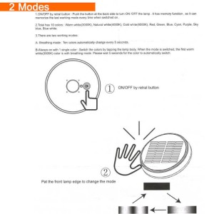 - Mode B — Couleur fixe : choisissez 1 couleur (sélection par tap/pression sur le corps). Au changement de mode, le blanc chaud (3000K) apparaît d’abord en effet "respiration". Patientez ~5 s pour la bascule automatique.