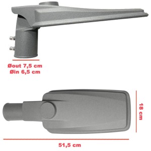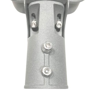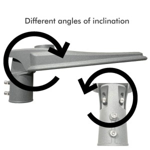 Le réverbère est équipé d’un connecteur pivotant de 60 mm de diamètre avec double vis de serrage, permettant une installation rapide et stable sur les mâts d’éclairage standards. Ce système de fixation offre un maintien solide et un ajustement facile de l’orientation lumineuse.