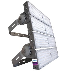Le Projecteur LED 1200W haute puissance est une solution d’éclairage professionnelle conçue pour offrir une luminosité exceptionnelle et une fiabilité durable dans les environnements les plus exigeants. Composé de quatre modules indépendants de 300W chacun, ce modèle intègre le driver réglable Philips Xitanium 1-10V (compatible DALI) et la technologie LED Bridgelux SMD5050 / 8W / 24V pour atteindre une efficacité lumineuse remarquable de 220 lumens par watt.