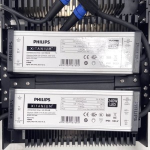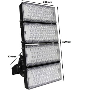Composé de quatre modules de 120W, ce projecteur est conçu pour éclairer efficacement de grandes surfaces telles que les stades, les aéroports, les zones portuaires ou les parkings industriels. Son système modulaire permet d’adapter la puissance selon les besoins : il peut être configuré en 240W, 480W, 960W ou plus en ajoutant simplement des modules supplémentaires, tous compatibles avec le driver Philips Xitanium.